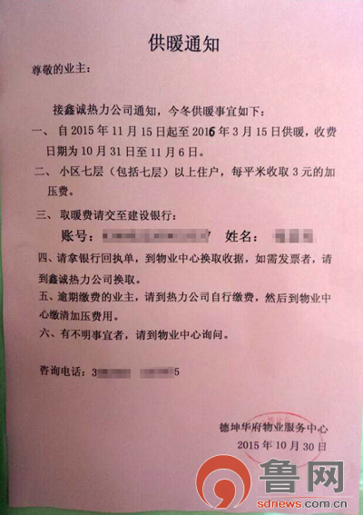 本月月初,德坤·华府住宅小区业主向本网记者反映,该小区物业公司要求小区7层以上供暖住户,在正常交纳供暖费用的基础上,再按每平方3元的价格交纳所谓的加压费。此举让众多业主困惑不解,既然已经正常交纳了取暖费,为何还有加压费一说?业主刘先生说“据我们了解,现在不允许物业公司向业主收取加压费,我们小区物业的这种行为应该属于乱收费。”
