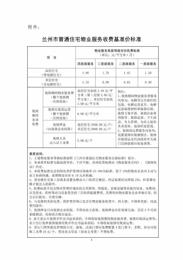 兰州市普通住宅物业服务收费基准价标准》经今年2月份向社会公开征求意见后,5月15日,兰州市物价局、兰州市住房保障和房产管理局正式印发了《兰州市普通住宅物业服务收费基准价标准》,该收费基准价对应兰州市普通住宅物业服务星级标准,星级服务等级越高,对应的物业服务收费基准价标准越高。新标准明确,四星级物业服务收费最高,高层带电梯住宅收费标准为不高于1.9元/平方米·月,多层不带电梯住宅收费标准不高于1.1元/平方米·月。